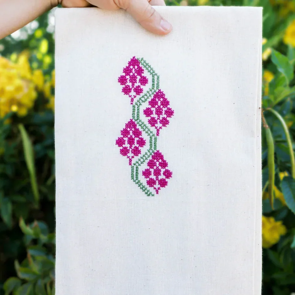 Hand embroidered by refugee and low-income women artisans with a traditional Palestinian tatreez design. Sold in sets of four (2 square and 2 oval coasters).