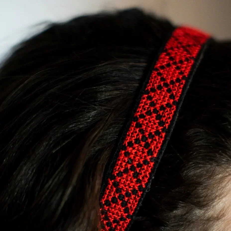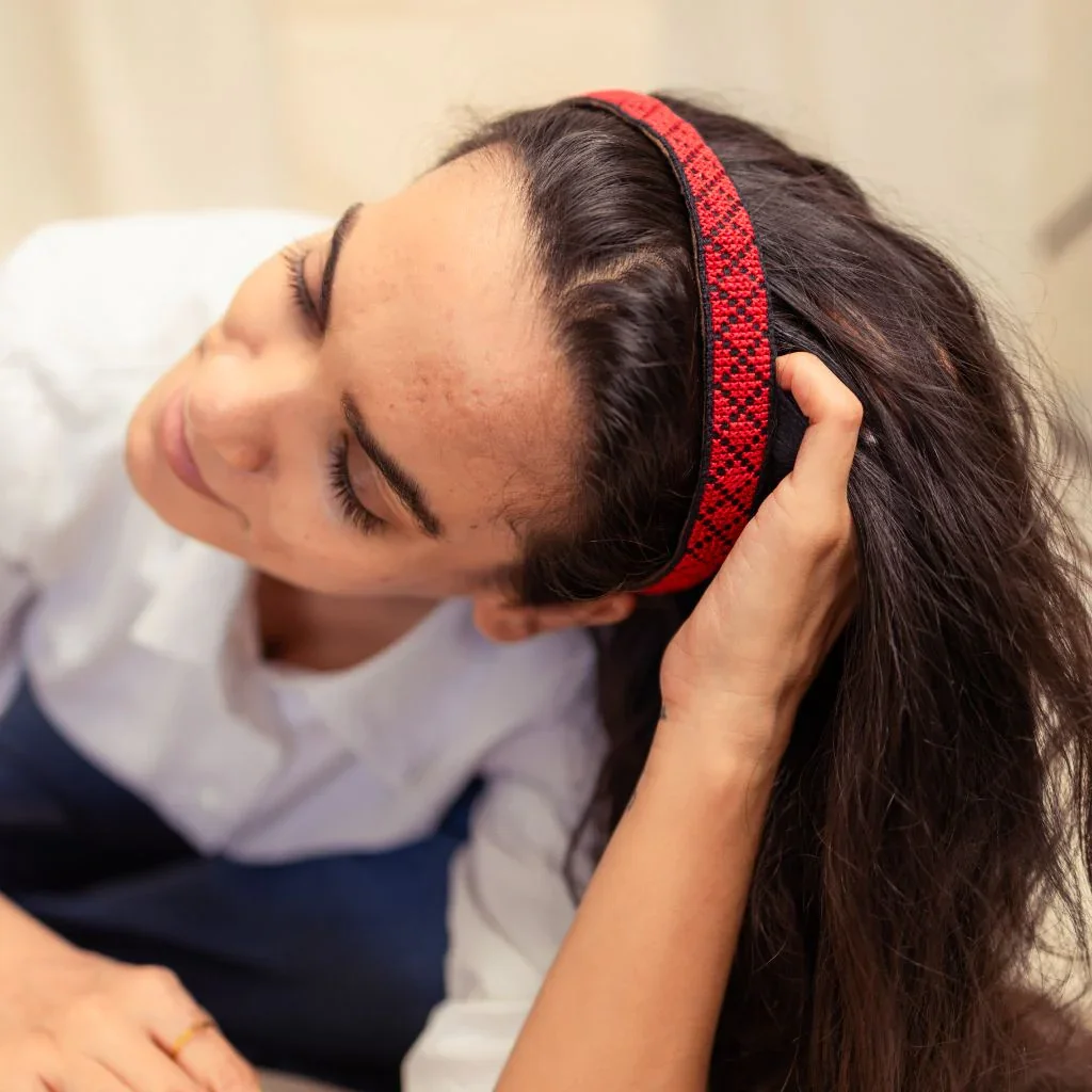 These scrunchies are hand embroidered by refugee and low-income women artisans with traditional Palestinian tatreez design.