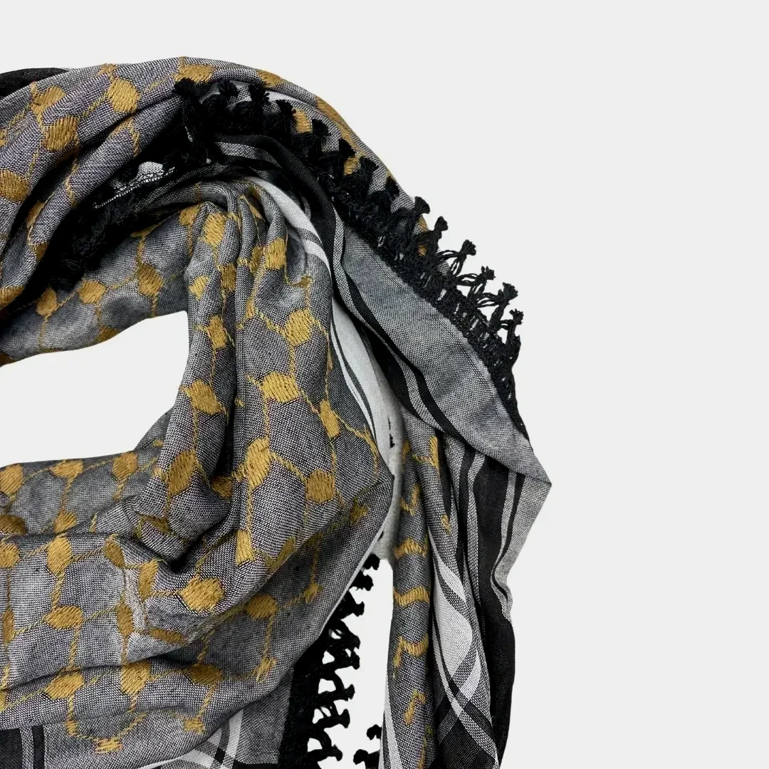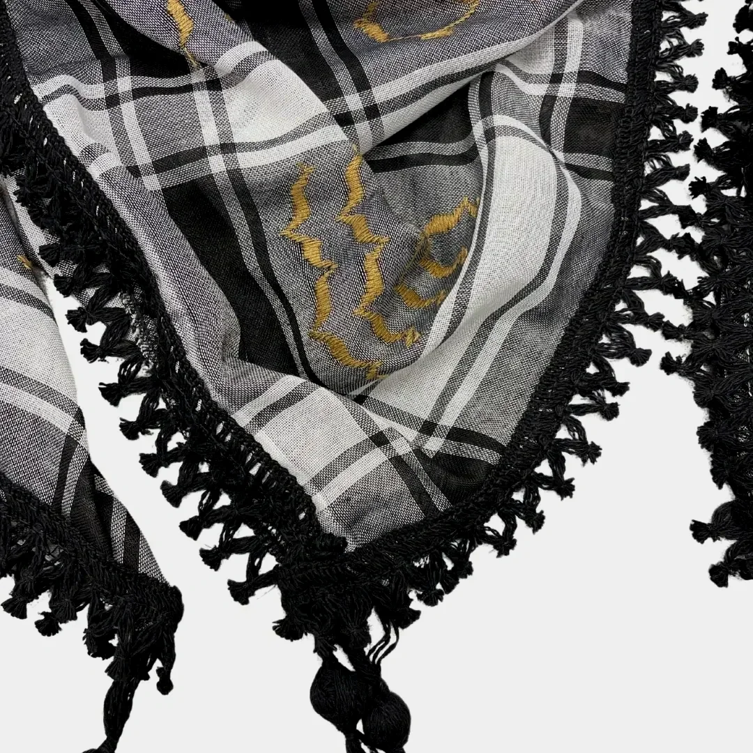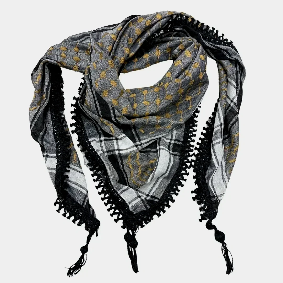 These Kuffiyehs, woven with tradition and resilience, are not just accessories, they're symbols of heritage. Handcrafted (with beautiful thick black Tassels) in Jordan, each Kuffiyeh speaks volumes of a rich cultural tapestry.