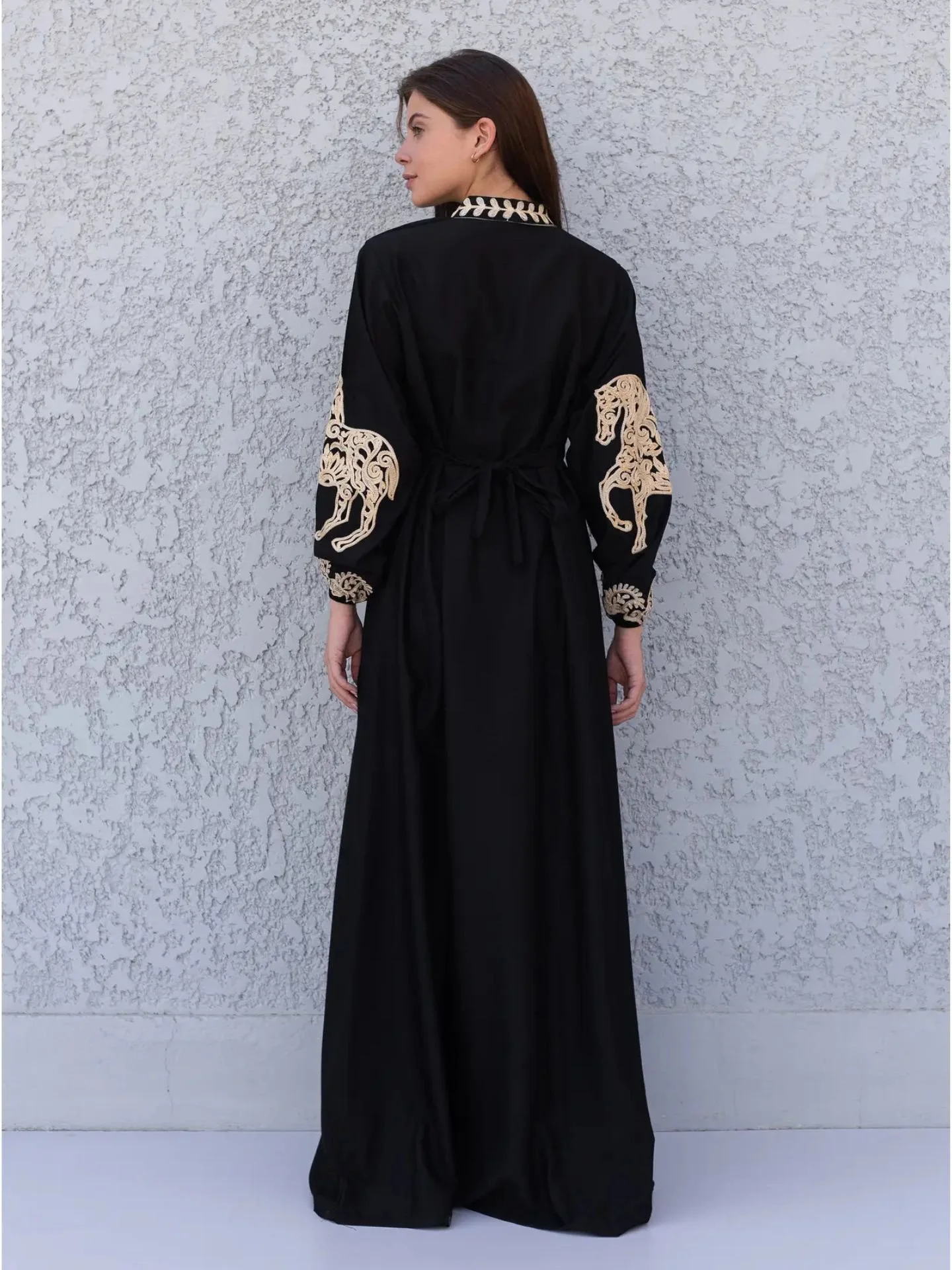 Feel like absolute royalty in this luxurious Kaftan Maxi dress, adorned with its striking and intricate embroidery that catches the eye. It comes complete with a built-in waist tie belt that beautifully accentuates your figure.