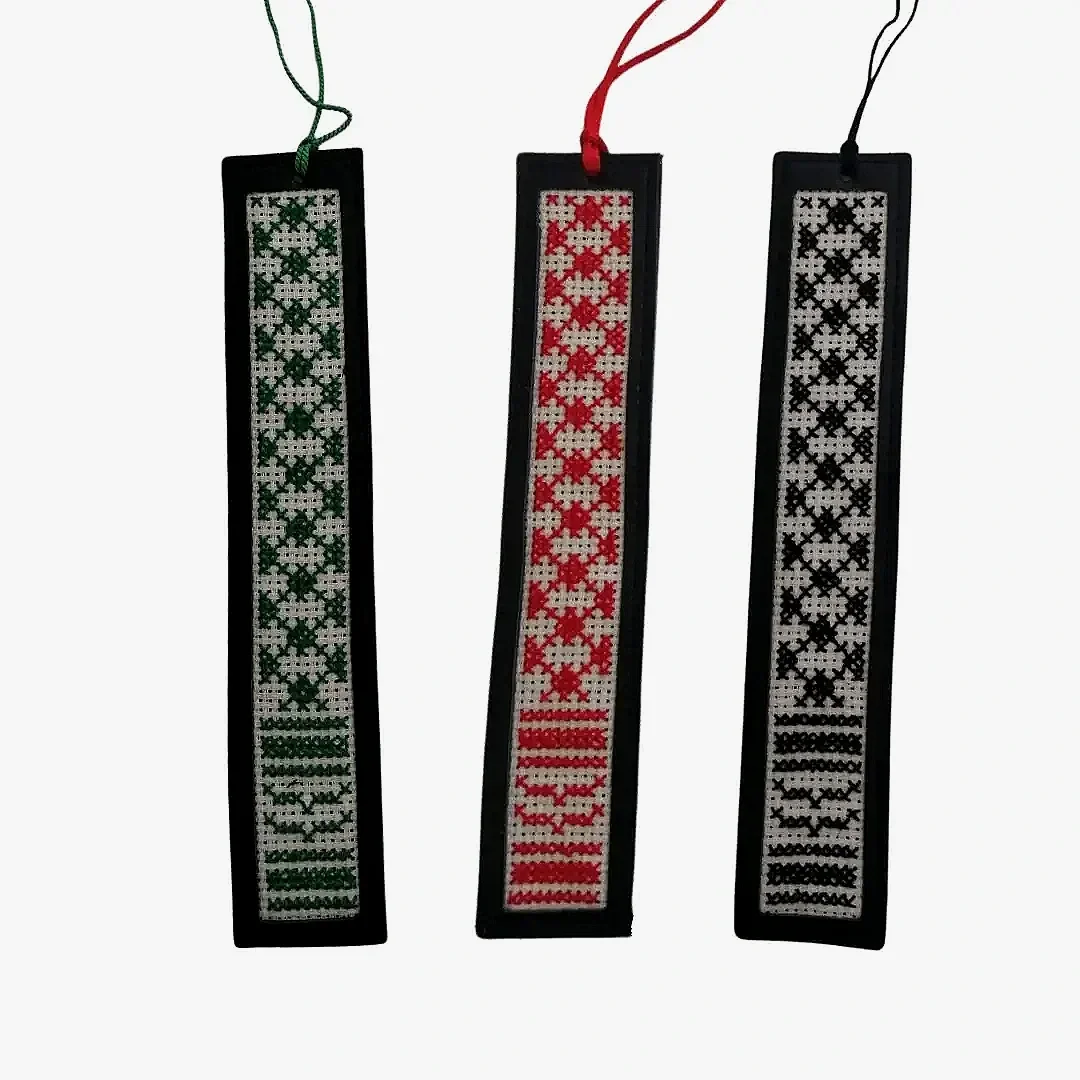 Each bookmark is hand-embroidered with by refugee and low-income women artisans with a traditional Palestinian tatreez design.